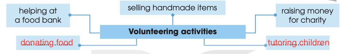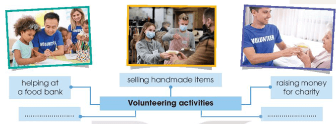 (Làm việc theo cặp. Hoàn thiện bản đồ tư duy với các hoạt động tình nguyện phổ biến cho thanh thiếu niên. Sử dụng những hình ảnh dưới đây để giúp bạn)